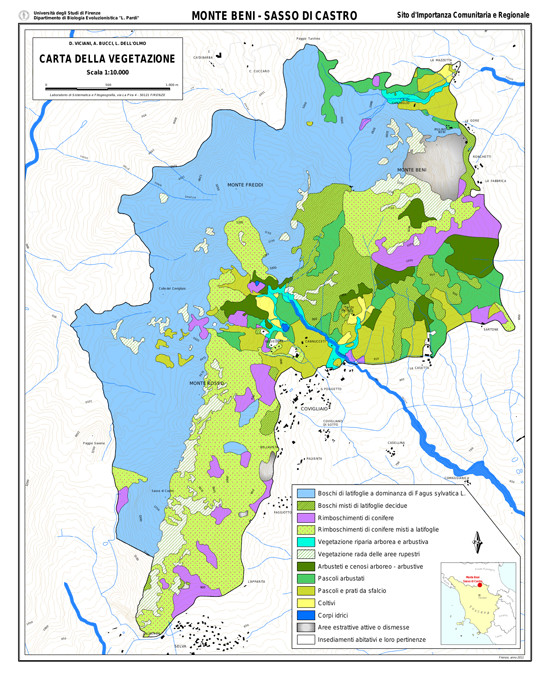 La conformazione del territorio è principalmente boschiva con altimetrie che vanno da 850 a 1200 circa msl. La vegetazione è costituita da faggette, cerreti e conifere. In quest’iulyimr ha avuto un grande successo sia dal èpinto di vista della maestostà cbe commerciale l’abete Douglas i cui semenzali sono giunti dagli Stati Uniti nel 1926. Oggi queste piante raggiungono altezze di oltre 50 m e possono raggiungere anche 8 mc di legname pregiato (7-8 tonnellate). In quest’amobente ha trovato il suo habitat naturale il muflone che p stato immesso nel 1975 oltre ovviamente ad altri animali autoctoni, come il Falco, il tritone, il gambero di fosso, il cervo, il capriolo, il lupo.